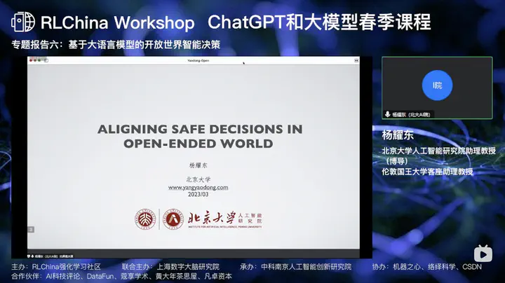RLChina 2023:基于大语言模型的开放世界智能决策Last updated on Aug 15, 2025大语言模型在智能问答上体现出了惊艳的效果。如果利用大语言模型中的通识辅助智能决策是迈向通用人工智能的关键步骤。本讲中,杨耀东老师将会介绍决策模型序列化的工作以及决策模型与大语言模型的对齐问题。相关技术在灵巧手操作、我的世界中已取得重要进展。视频链接课件链接